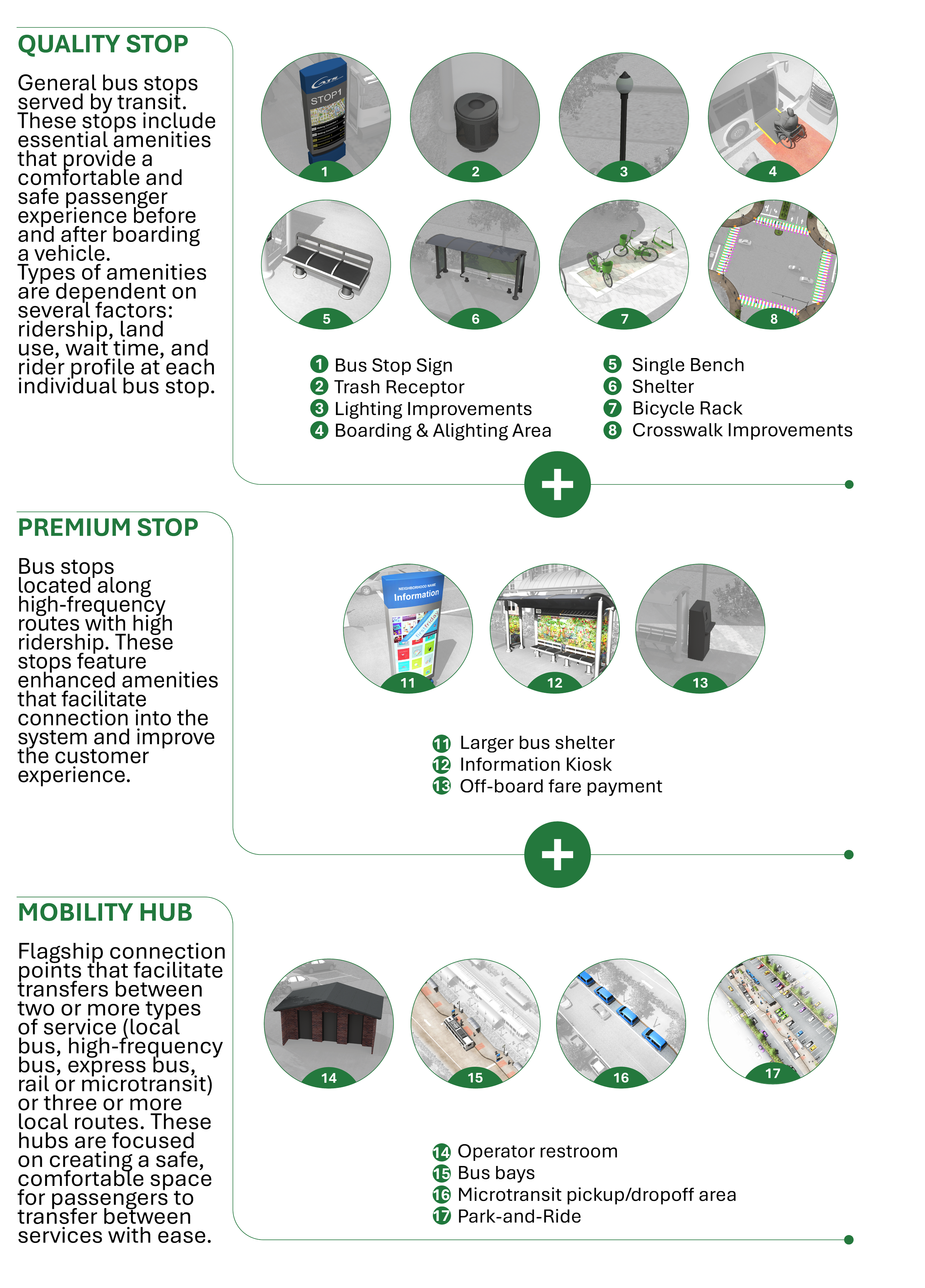 The project clearly defines and distinguishes Quality Stops, Premium Stops, and Mobility Hub amenities, establishing scalable design standards for transit facilities across the Charlotte area. Overall, the goal is to enhance rider experience, improve operational efficiency, and support a more connected, accessible, and vibrant transit network for the region