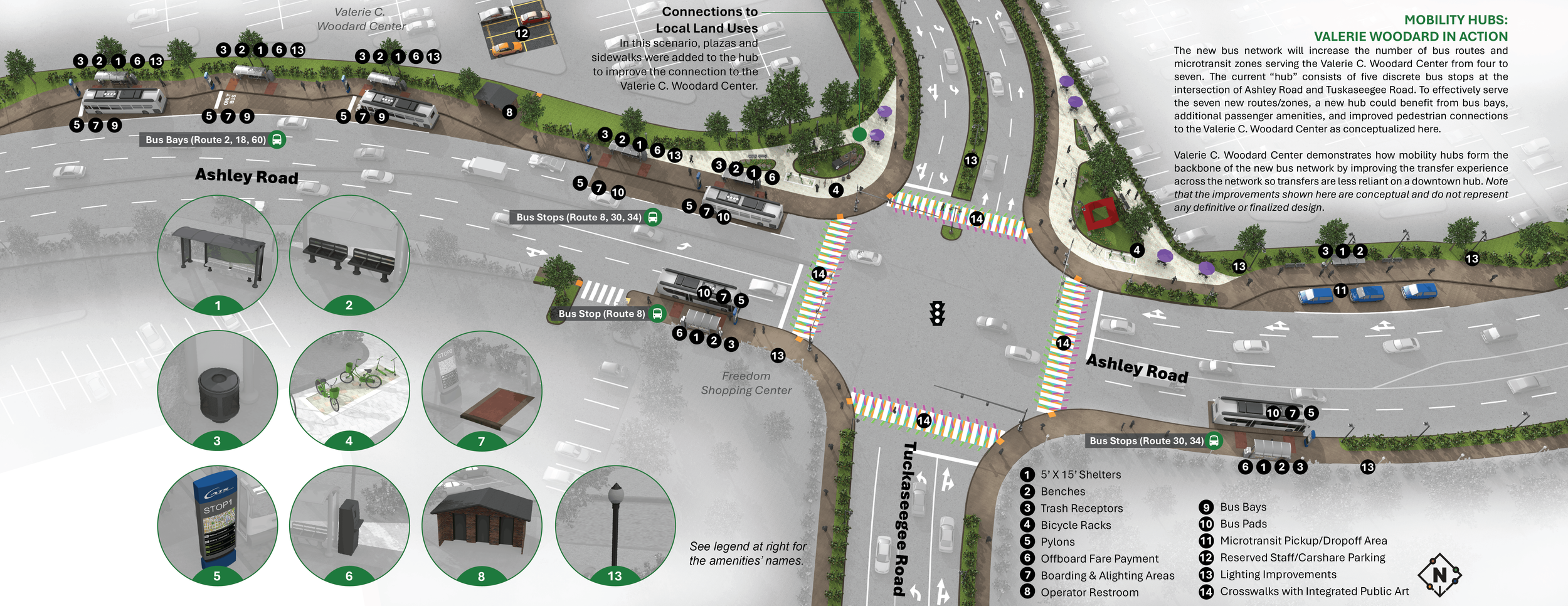 The effort includes 3D modeling and renderings for the Valerie C. Woodard Transit Center that illustrate improved bus bays, stops, passenger amenities, and adjacent street enhancements to strengthen safety, accessibility, and multimodal connectivity.